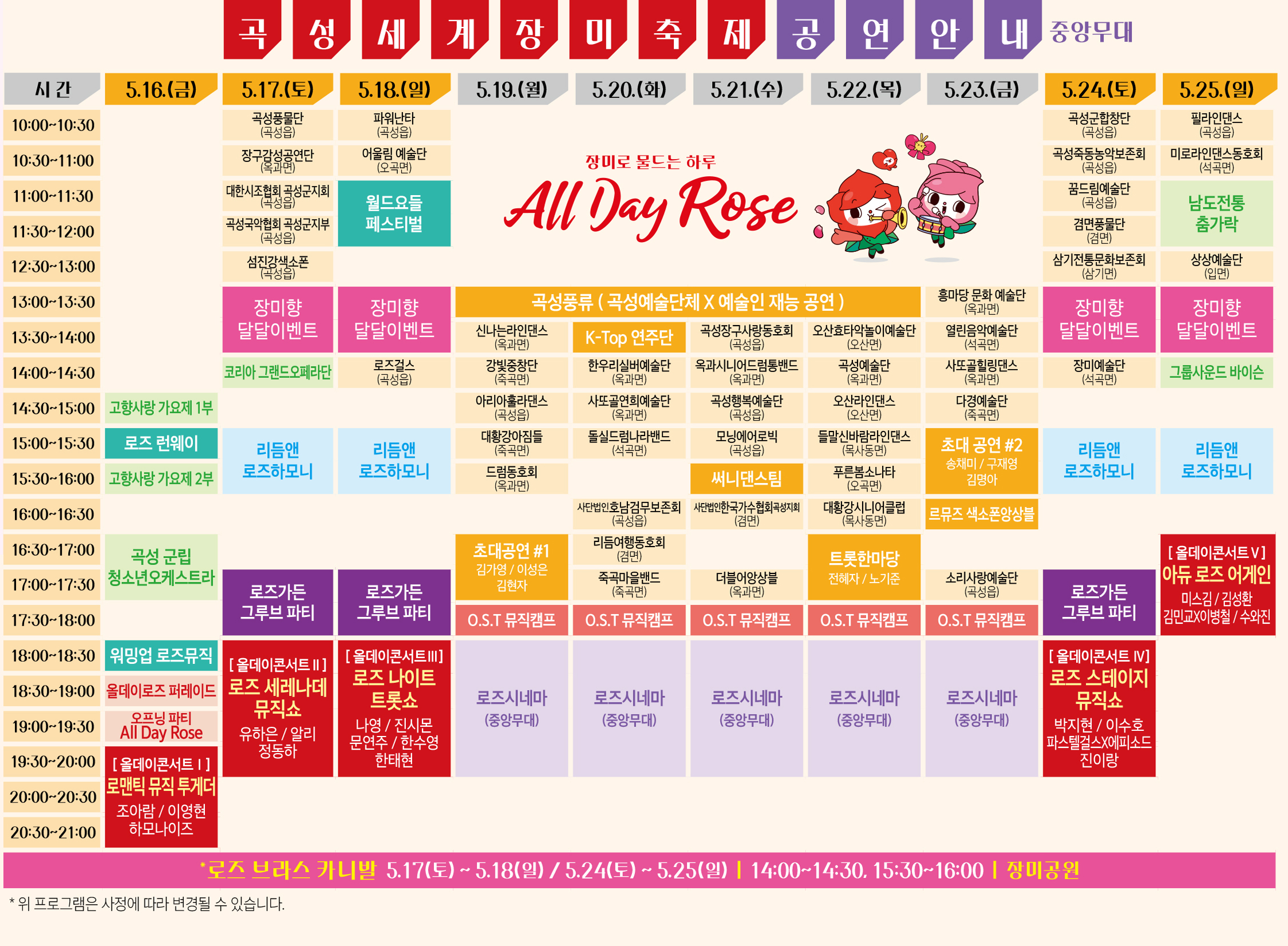 - 장미 퍼레이드 : 대형 꽃차 행진과 퍼포먼스 팀들의 공연