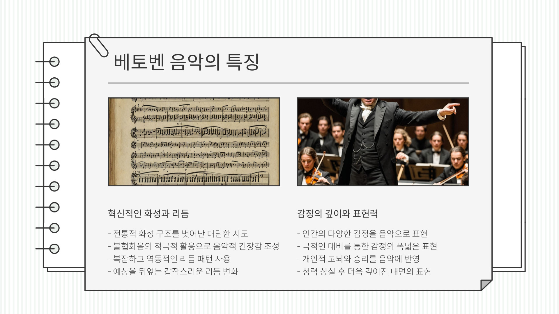 베토벤은 하이든, 모차르트의 고전주의를 계승하면서도, 감정과 인간 정신을 강조한 낭만주의의 문을 연 인물입니다.