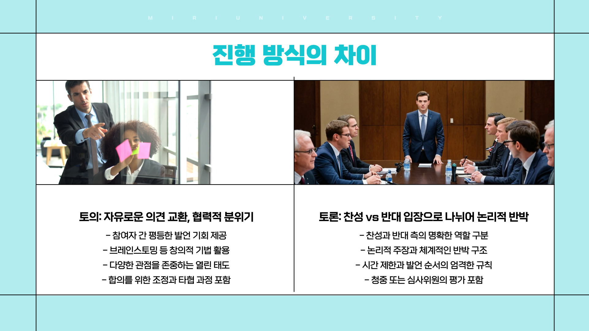 비슷하게 들리지만, ‘토의’와 ‘토론’은 목적과 방식이 완전히 다르답니다.2. 핵심 차이 요약표