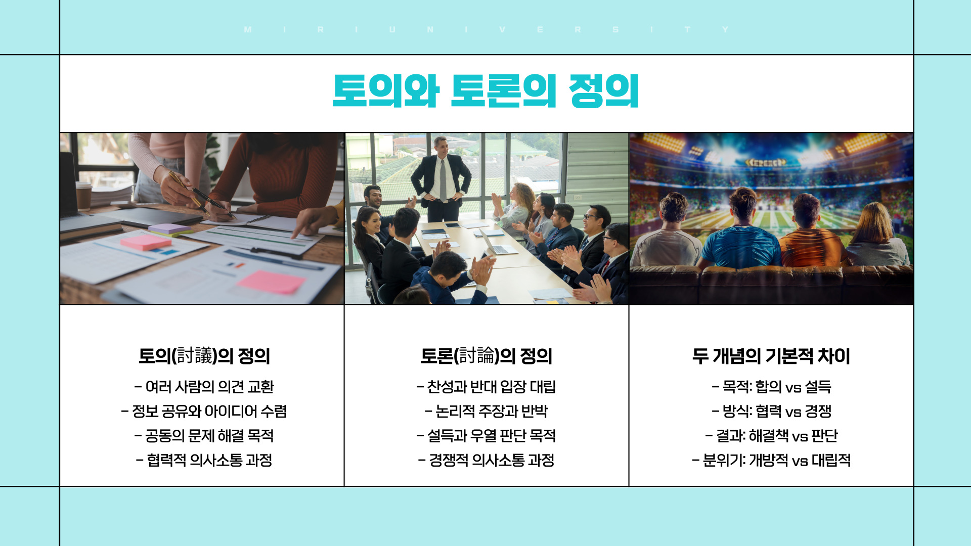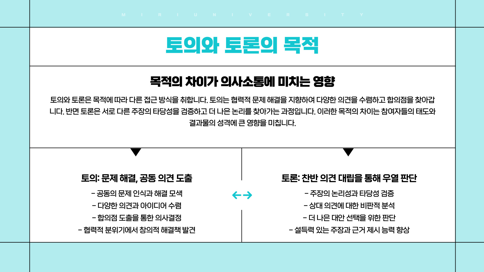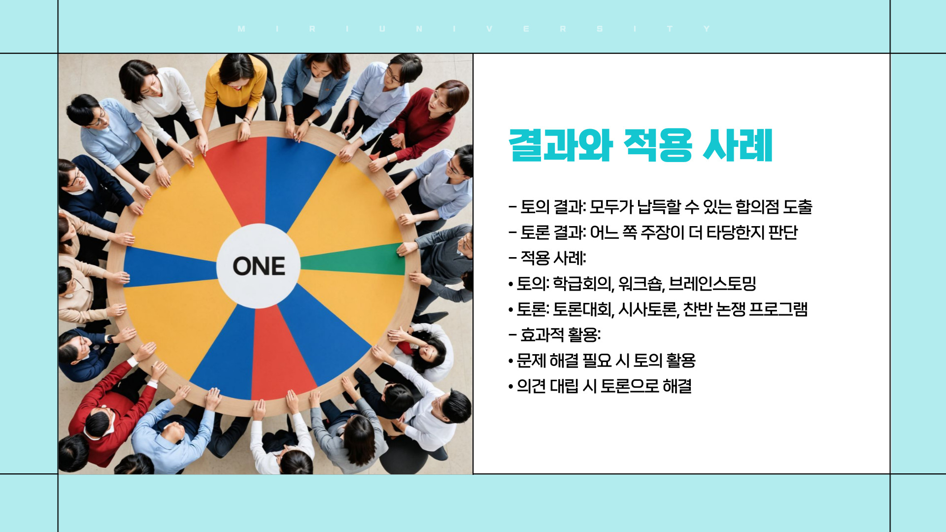 토의는 다양한 생각을 모아서 같은 방향의 결론을 찾는 과정입니다.